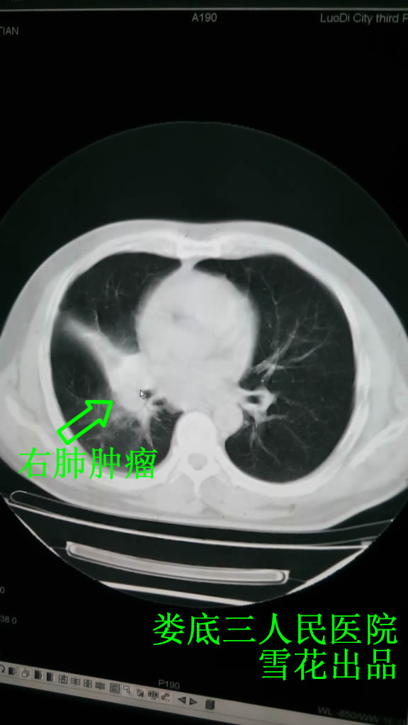 邹XX,男,47岁,因“阵发性咳嗽咳痰2月”到湖南省肿瘤医院行肺部CT检查考虑右肺癌,行纤支镜检及活检,确诊为右肺小细胞肺癌局限期。在湖南省肿瘤医院行4周期化疗,均给予“VP-16 0.21 d-3 DDP 132mg d1”,为求放疗来我院,入院查肺部CT示:右下肺支气管狭窄并软组织,考虑中央型肺癌并右肺下叶阻塞性肺炎,右侧斜裂增厚,纵膈、腔气间隙、隆突下及右肺门多发淋巴结肿大(见图一)。立即给予右肺肿块及纵膈淋巴结三维适形放疗48Gy/16次/22天,当时患者舌脉未见明显异常,但考虑到放疗可能会伤津耗气,于放疗第3天开始给予补中益气汤+滋阴润肺药物口服,每日一剂,分两次服。