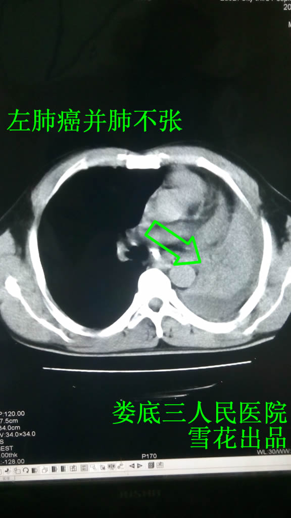 口服2付后痰中带血颜色变浅,口服5付中药后痰中带血明显好转,患者终于答应坚持放疗,之后针对左肺肿块行三维适形放疗24Gy/8次,这样左肺肿块共放疗DT:53Gy/21次,期间一直给予中药口服(方药同前),患者放疗后稍咳嗽,无痰中带血,病情好转出院,出院时考虑患者已无痰中带血,把上方稍做改动,去白茅根,加桑白皮12克、鱼腥草15克清热泻肺止咳,患者在家坚持口服中药,3月后来院复查,患者精神饱满,诉饮食起居一切正常,无特殊不适,复查肺部CT示左肺肿块明显好转,左肺复张(见图二),5个月的时间,让患者的左肺判若两人,如获新生。