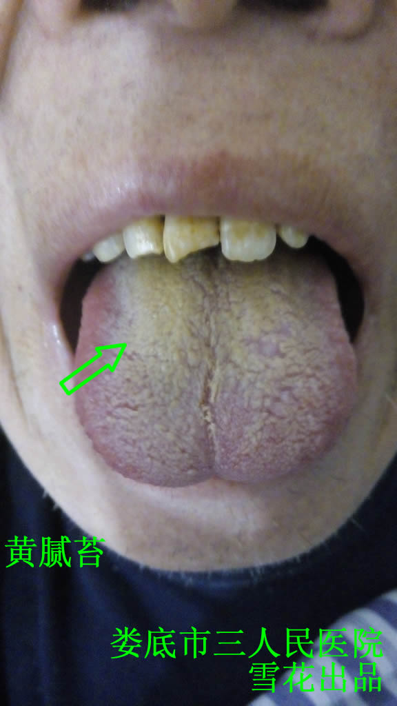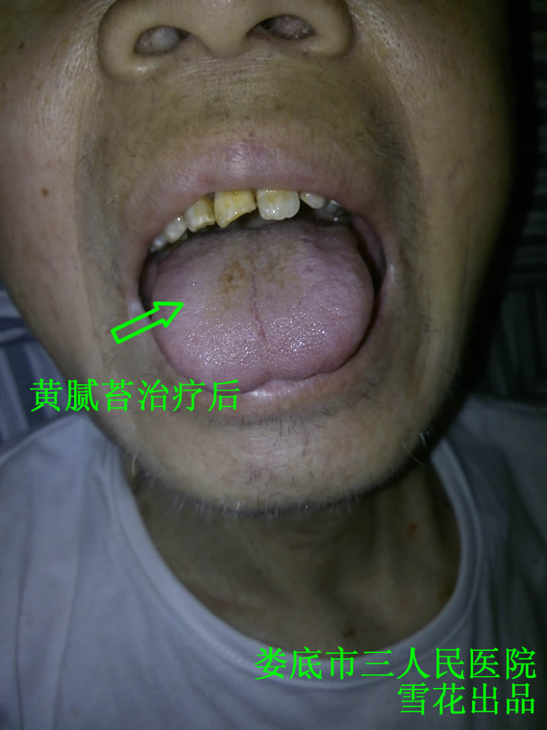 口服5剂后患者食欲好转,每餐可进少量饮食,大便通畅,精神好转,气促也较前好转,继续化疗(方案同前),同时服用中药(同前方),化疗后患者浅表淋巴结迅速消退,化疗后Hb反升至71g/L.,查B超示双侧胸水较前明显减少,停病危,改病重,再看舌象:舌质红润,黄苔已去多半(见图二),观察3个月,浅表淋巴结一直没有再长大,胸水也未再增长。