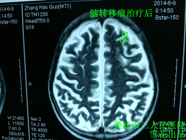 出院后患者家属不放心,又到湖南省某三甲医院诊疗,检查发现肺部情况平稳,头部多发转移灶已经较前明显好转,基本已经看不到转移灶了,相关专家建议患者无需治疗,回家观察即可,患者家属不甘心,坚持要做陀螺刀,最后这家医院也象征性的用1.8Gy的剂量给患者用陀螺刀照射了一次,患者及家属高高兴兴回家了。回家后坚持口服中药(方同前),一般情况良好,无特殊不适,3月后复查肺部CT较前无明显变化。复查头部MRI未见明显异常(见图三、四),建议患者在家继续坚持口服中药。